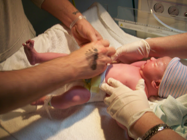 I arrived for my appointment at 10 am sharp. I was so anxious to make arrangements for our girl's arrival! She had other plans. When Dr. Owens checked me I was 4 cm dilated and 100% effaced. He looked at me and said "We're going to have a baby today." I thought my head would explode. Naturally, I had come to this appointment alone. I was shaking as I dialed Chance's number... four rings and then voicemail. I called again... same thing. Again... Then I tried the house... nothing. I was panicked when I called my Mom and told her what was going on. She assured me that someone would get in touch with Chance and that he would in fact be there for the arrival of our little one. That was the longest elevator ride of my life, and I was only going down one floor. With a smile I marched into Labor and Delivery and announced to the nurses that I was going to have a baby today!! We began the admitting process and within minutes I was getting cozy in Labor Room 1. I was so excited, nervous, scared, worried, happy and sad- all at the same time. I had been in my room for about 20 minutes when my Mom showed up. She had been at work, but left everything to be there with me. At about 11:30 I began to panic about the fact that I still had not heard from Chance; coincidentally this was around the time that they began my Pitocin drip. Let me tell you that is some nasty stuff! Dr. Owens came to check in on me around noon; he decided to go ahead and break my water {I was dilated to 5 cm at this point.} That's when things really got going; I started to have some pretty serious contractions. By 2 o'clock when the nurse asked me if I was ready for some pain relief I couldn't say yes fast enough. First they gave me Stadol. I should note that I have absolutely no tolerance for medication. I was somewhere between complete oblivion and puking my guts up when the "epidural man" as I called him plowed {and yes, I do mean plowed} through the door. He was loud, crass, and rough- all the things you pray your pain reliever isn't. I was terrified. And then in the middle of my nightmare Chance walked through the door. He immediately came and stood by me through the entire procedure. It was such a relief having him there.